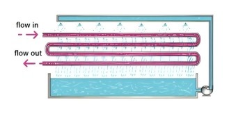 The spray-type heat exchanger is a type of tube-type heat exchanger,where heat exchange tubes are fixed in rows on a steel frame; the hotfluid flows inside the tubes, while cooling water is sprayed uniformlyfrom above via spray devices.